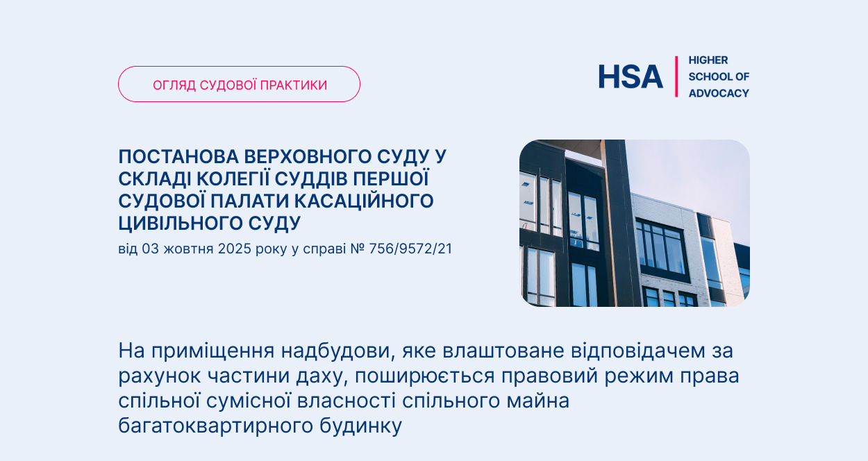 Задовольняючи позов ОСББ «Оазис 4», суд першої інстанції, з висновками якого погодився й апеляційний суд, правильно виходив з того, що на приміщення надбудови, яке влаштоване відповідачем за рахунок частини даху, поширюється правовий режим права спільної сумісної власності спільного майна багатоквартирного будинку, а відтак, будь-які переобладнання або перепланування, могли здійснюватися відповідачем тільки за згодою співвласників, балансоутримувача і за умови, що такі зміни не призведуть до порушень прав власників інших квартир у багатоквартирному житловому будинку, у той час, як встановлено, ОСОБА_1 не отримала відповідної згоди співвласників будинку, а здійснені нею переобладнання впливають на належну експлуатацію житлового будинку в цілому.
