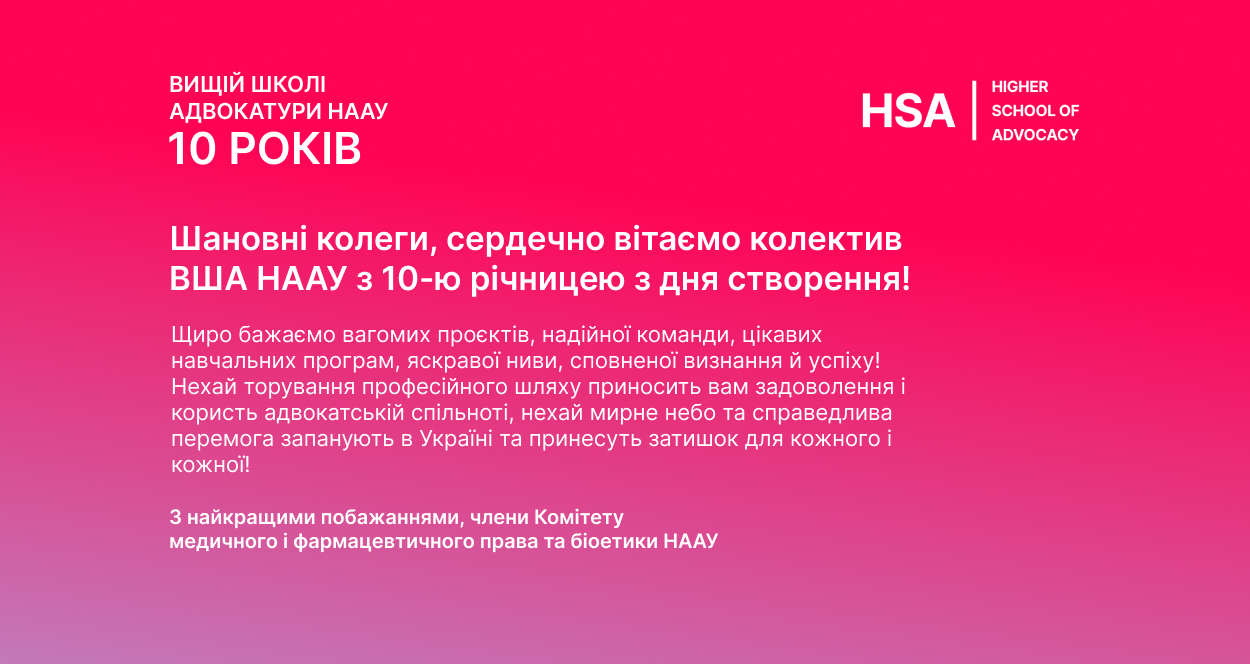Привітання Комітету медичного і фармацевтичного права та біоетики НААУ з десятиріччям Вищої школи адвокатури НААУ