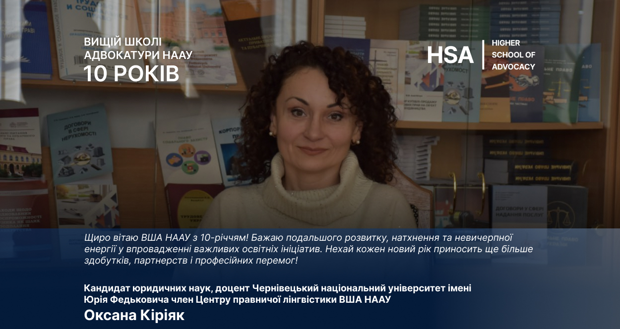 Привітання Оксани Кіріяк з десятиріччям Вищої школи адвокатури НААУ
