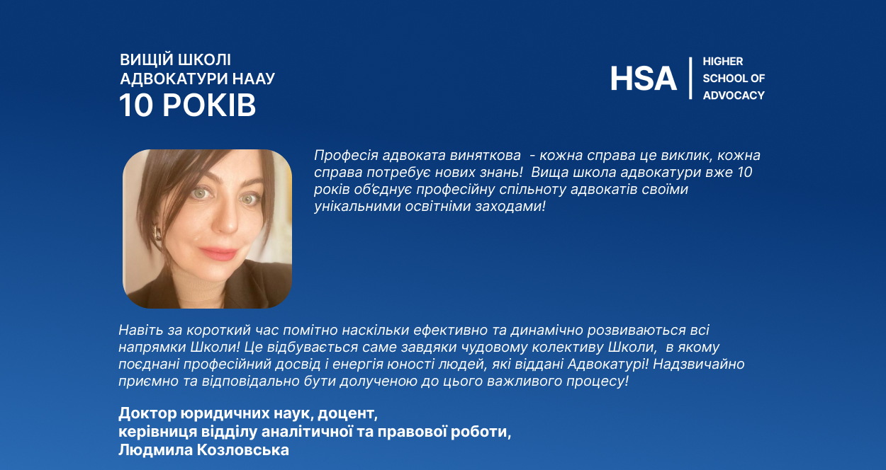 Професія адвоката виняткова - кожна справа це виклик, кожна справа потребує нових знань! Вища школа адвокатури вже 10 років об’єднує професійну спільноту адвокатів своїми унікальними освітніми заходами!