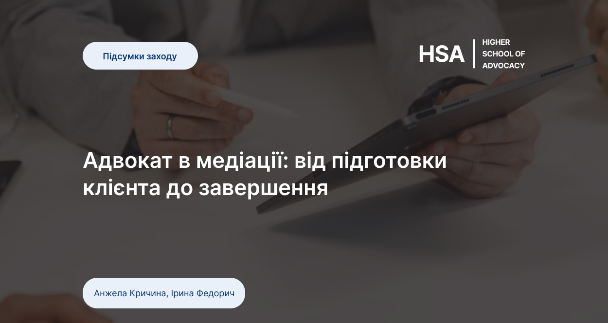 Про адвоката в медіації: від підготовки клієнта до завершення розповіли Анжела Кричина – співзасновник, член Наглядової Ради та медіатор Асоціації Сімейних медіаторів України, співзасновник, член Правління та Координатор Соціального проекту Ліги Медіаторів України по співпраці із районними Службами у справах дітей Адвокат з досвідом роботи суддею загальної юрисдикції та Ірина Федорич – медіаторка, кандидатка юридичних наук, Голова Правління та членкиня Асоціації сімейних медіаторів України, членкиня ГО «НАМУ», ГО «Фокус права» запрошена викладачка Школи права Українського Католицького Університету під час заходу з підвищення професійного рівня адвокатів, що відбувся у Вищій школі адвокатури НААУ.
